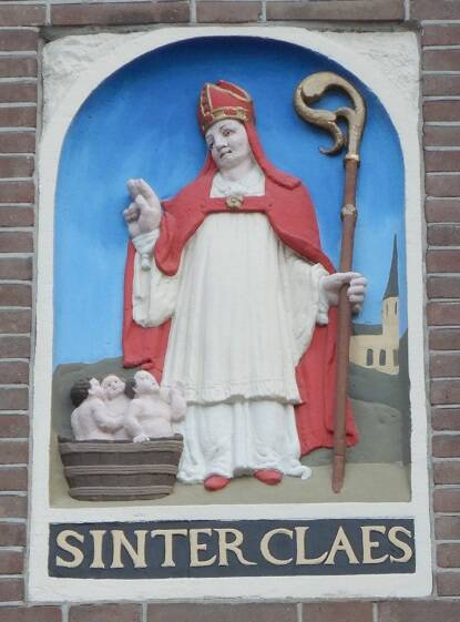 De gevelsteen is al eeuwenoud. Al in 1564 wordt het pand naar Sinter Claes vernoemd; Begin 17de eeuw zou het uithangbord plaatsmaken voor de gevelsteen. Op diverse geschilderde en getekende Damgezichten zijn pand en steen herkenbaar. Deze (zij)gevel kwam overigens pas in 1567 aan de Dam te liggen. Vanwege de voorgenomen bouw van het Waaggebouw werden de huizen ten noorden van de Dam tussen Nieuwendijk en Damrak afgebroken, en stonden de panden aan de noordzijde van de toenmalige Watersteeg ineens aan de Dam.