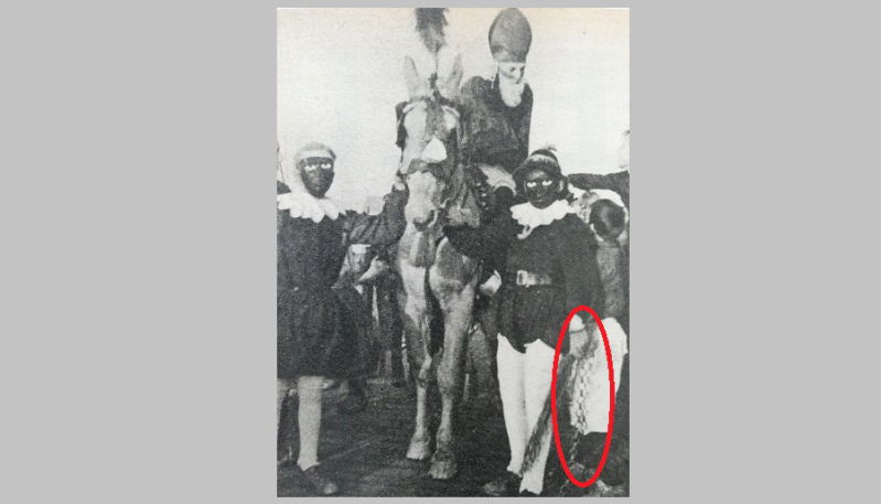 Er wordt in oude bronnen ook vaak gesproken over Sint Nicolaas of een andere figuur op stelten/ ook wel: op krukken (de duivel op krukken). Dit kennen we uit het spreekwoord “De boel op stelten zetten.” Het maken van lawaai komt ook terug in de Sint Nicolaas viering. In de Scandinavische Landen vinden we het terug in het woord Yule (Joel) voor de midwinterfeesten, waar het Nederlandse woord joelen van is afgeleid dat ook lawaai maken betekent! Denk in het Sinterklaasfeest aan het Wild Geraas, de kettingen die de begeleiders van Sint Nicolaas met zich meedragen waarmee herrie gemaakt wordt en het bonzen op ramen en deuren of hard bellen met een bel of met de trekbel bij de voordeur. In de meeste landen waar Sint Nicolaas gevierd wordt gebruiken de begeleiders de kettingen tot op de dag van vandaag. De ketting, of te wel ketenen, worden ook in het boek uit 1840 beschreven als zijnde een attribuut van de duivel. We zien dit gegeven terug in diverse schilderijen, o.a. in het bekende schilderij van Jan Steen. De oude vrouw (zie fragment - schilderij) op de achtergrond wenkt naar iemand die zich schuil houdt om tevoorschijn te komen. Mogelijk iemand die voor Sinter Klaas speelt en rammelt met de ketting oid. Onzichtbaar, want dat mocht niet, maar wel degelijk aanwezig. Mogelijk dat hij even later wel tevoorschijn kwam, hetzij als Sinter Klaas hetzij als zichzelf, geheel verontwaardigd dat de Sint net langs kwam nu hij er zelf niet was. Zeker nu de kinderen afgeleid zijn met cadeautjes. (Dit gebeurt nu nog wanneer vader of moeder naar de wc gaat en er (hoe bijzonder) op het raam gebonkt wordt en er een zak met cadeautjes voor de deur blijkt te staan, net nu moeder er niet was.) We zien dit ook bij Brakenburg. Ook tegenwoordig zet Zwarte Piet de boel nog regelmatig op stelten! Zo hoort het ook!