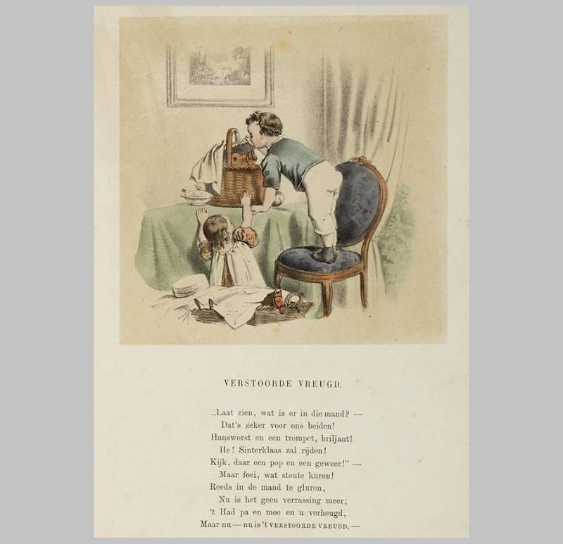 Omschrijving: Op een tafel staat een rieten mand die is afgedekt met een doek. In de mand zit een kind, dat tussen de doek en de rand van de mand naar buiten spiekt. Rond de mand liggen Sinterklaascadeaus, snoepgoed en een roe.