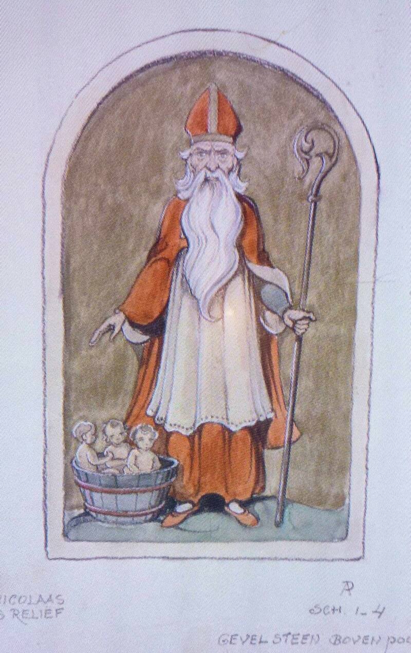 In de toegangspoort is aan de aankomstzijde een gevelsteen aangebracht waarop Sinterklaas te zien is met de drie kinderen in een kuip: een verwijzing naar de bekende mythe rond de Goedheiligman