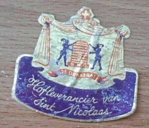Er staan drie symbolen van Sinterklaas: De maan die door de bomen schijnt, een gevulde klomp en een masker van de Sint.