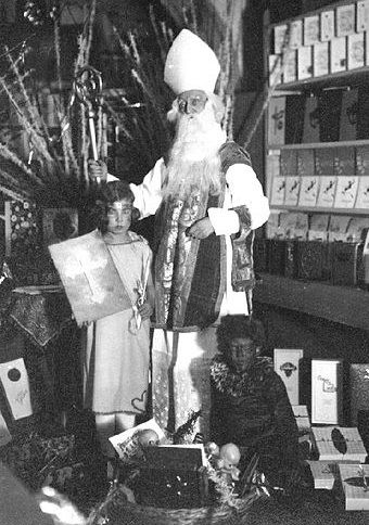 1944 Sloveense Sint Nicolaas en zijn donkere helper, Krampus, met een krullenpruik en hoorntjes op zijn hoofd! Let ook op de kraag. Hier liggen gelijkenissen met Zwarte Piet. Ook hier het zwarte gezicht, een mand (zak), Verder wordt Sint vergezeld door een engel. (Bron Klik Hier)