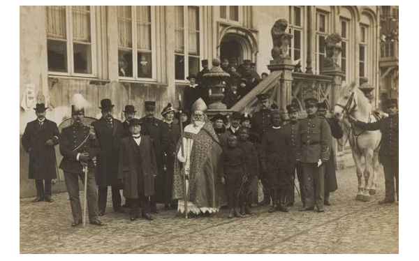 Opmerking: Zittend zit de knecht van Sinterklaas met zijn pik zwarte gezicht, draagt geen pruik en heeft geen ‘pietenkleding’ aan, maar een soort werkkloffie.